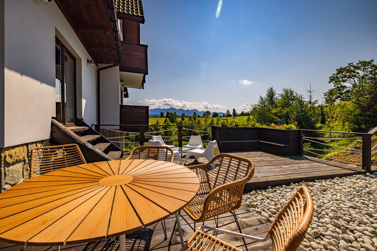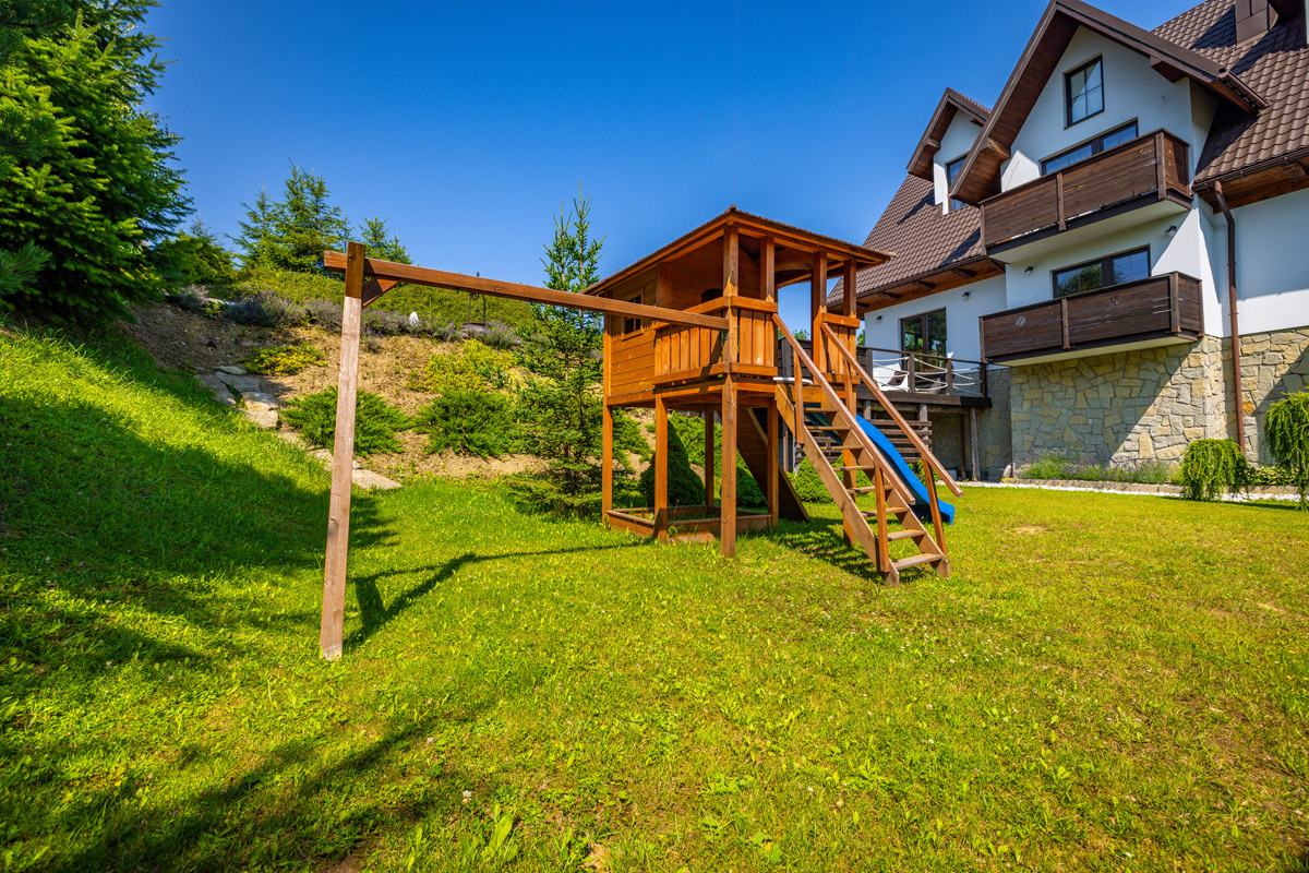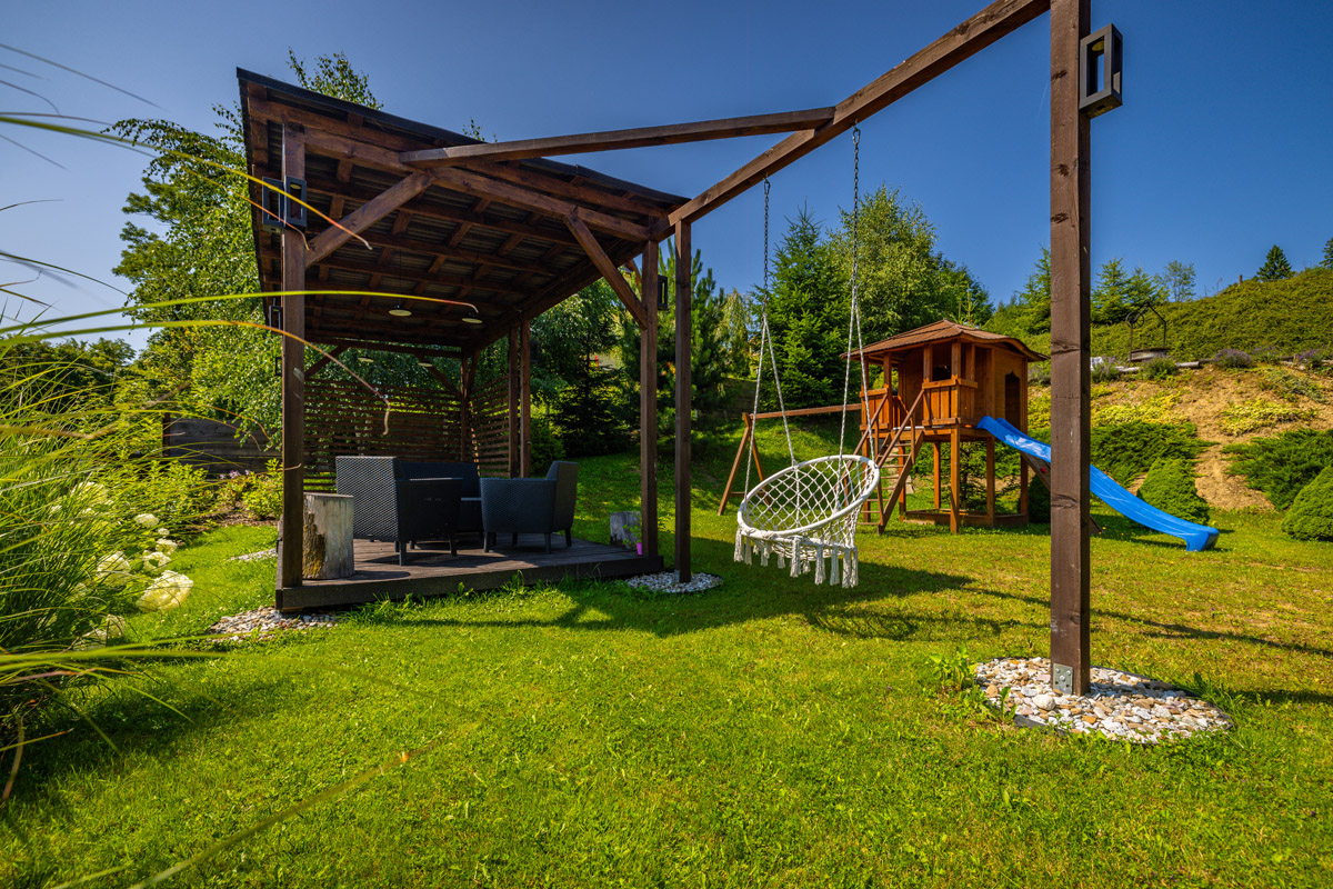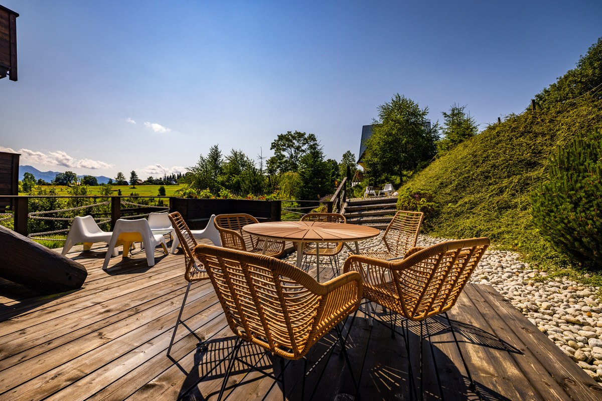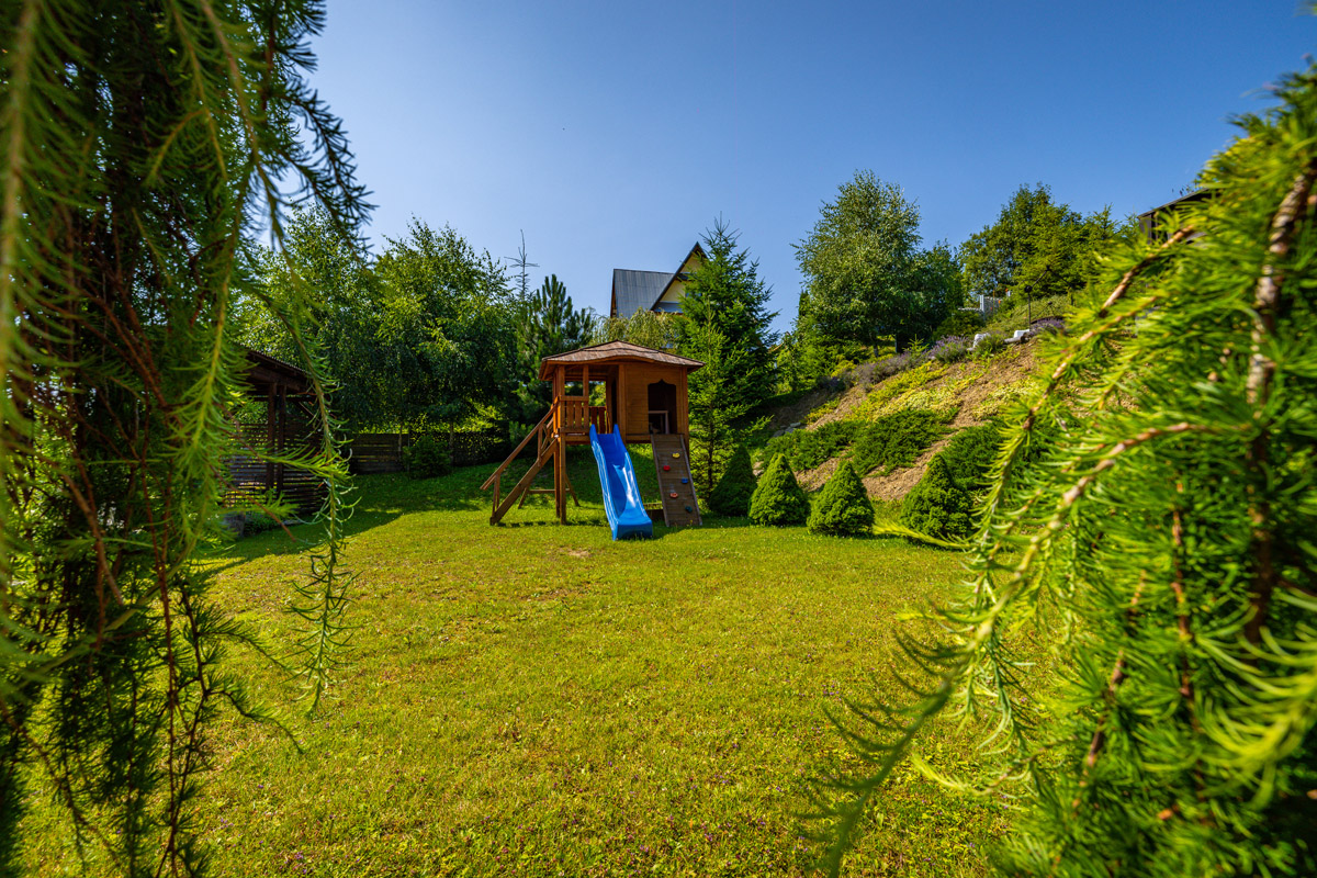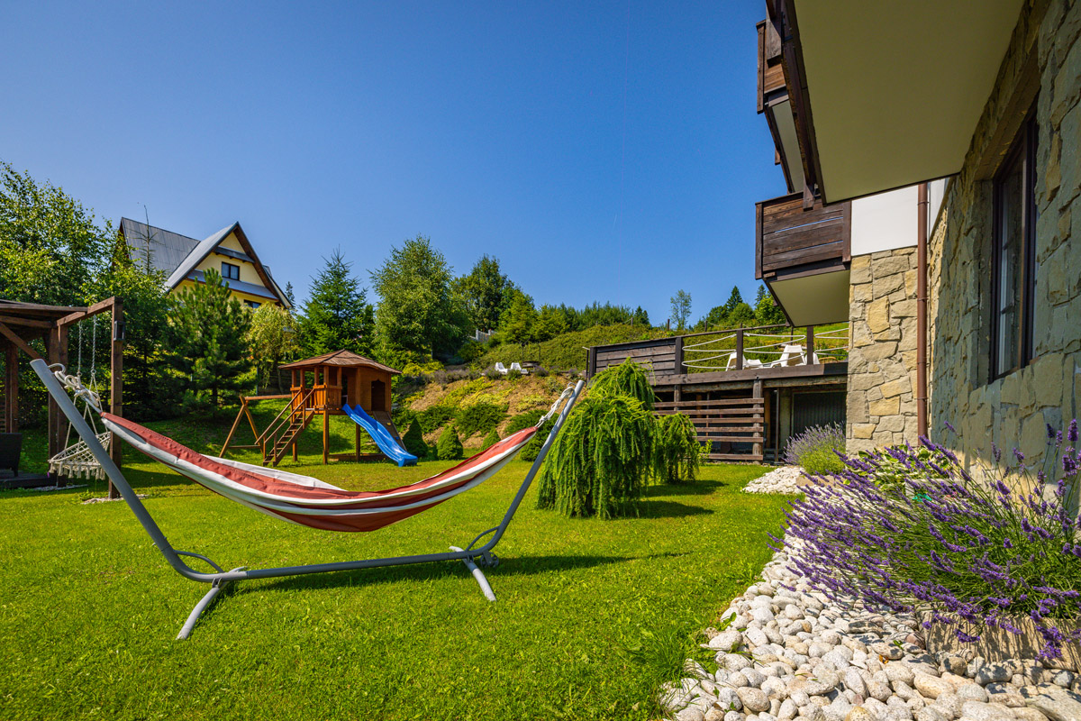 Mając takie widoki jak w Bystrym, grzechem byłoby ograniczać się do czterech ścian! Dlatego, przedłużeniem budynku jest duży, słoneczny taras z leżakami, na który zapraszamy od wiosny aż do późnej jesieni. Do dyspozycji naszych Gości oddajemy też piękny zielony ogród z mnóstwem atrakcji dla małych odkrywców, którzy znajdą w nim trampolinę, drewniany domek i inne zabawki.