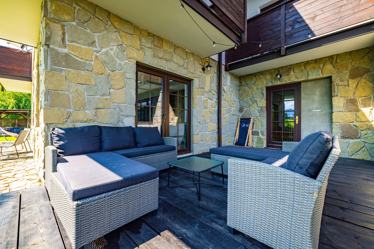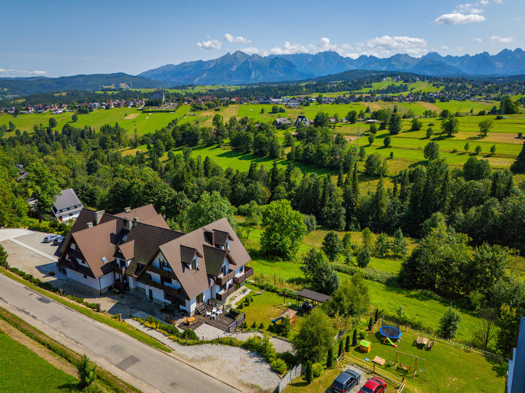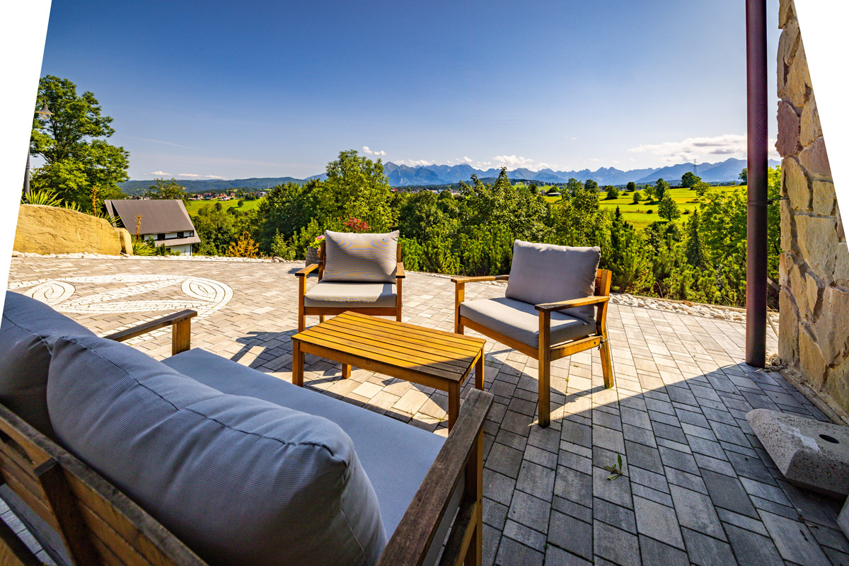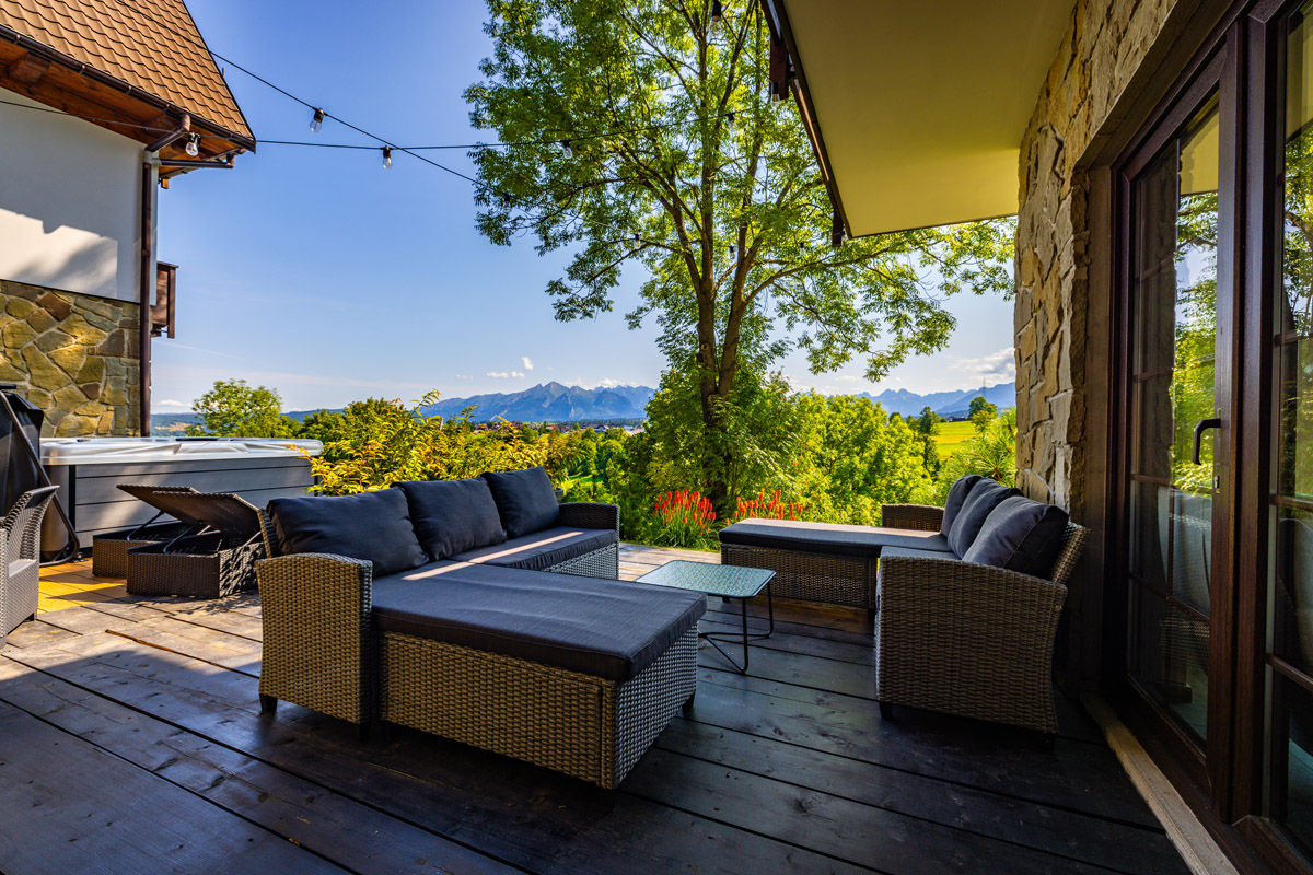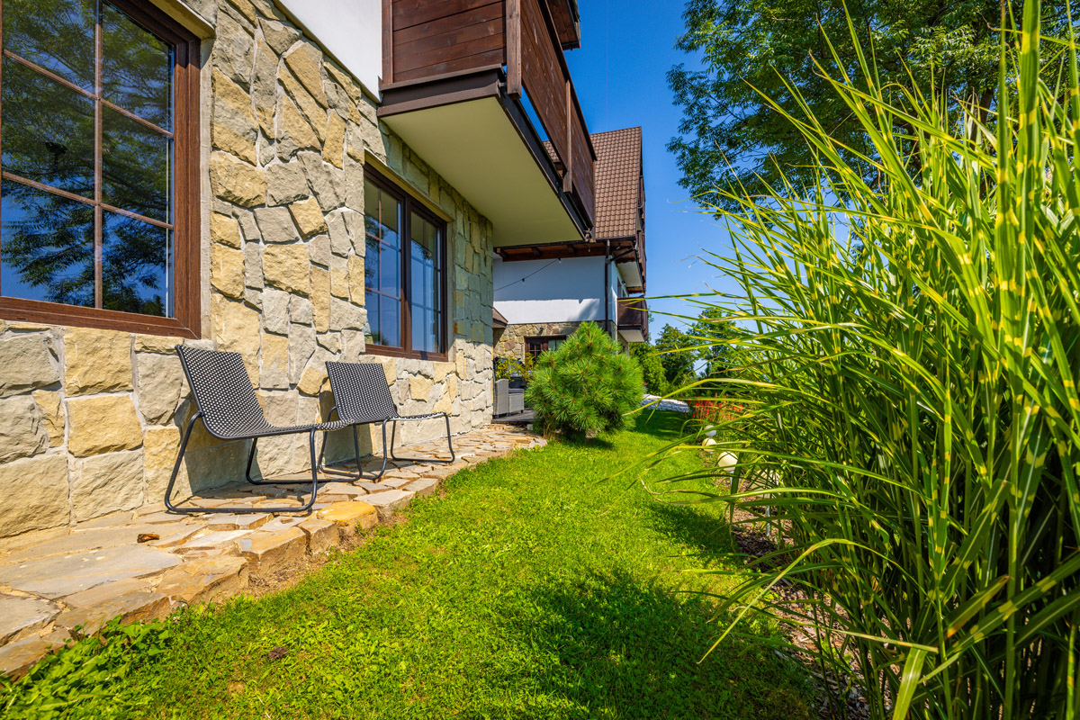Mając takie widoki jak w Bystrym, grzechem byłoby ograniczać się do czterech ścian! Dlatego, przedłużeniem budynku jest duży, słoneczny taras z leżakami, na który zapraszamy od wiosny aż do późnej jesieni. Do dyspozycji naszych Gości oddajemy też piękny zielony ogród z mnóstwem atrakcji dla małych odkrywców, którzy znajdą w nim trampolinę, drewniany domek i inne zabawki.